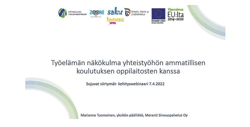 Meranti Siivouspalvelut Oy:n Marianne Tuomainen osallistui webinaariin työelämän edustajana puheenvuorollaan ”Työelämän näkökulma yhteistyöhön ammatillisen oppilaitosten kanssa”.